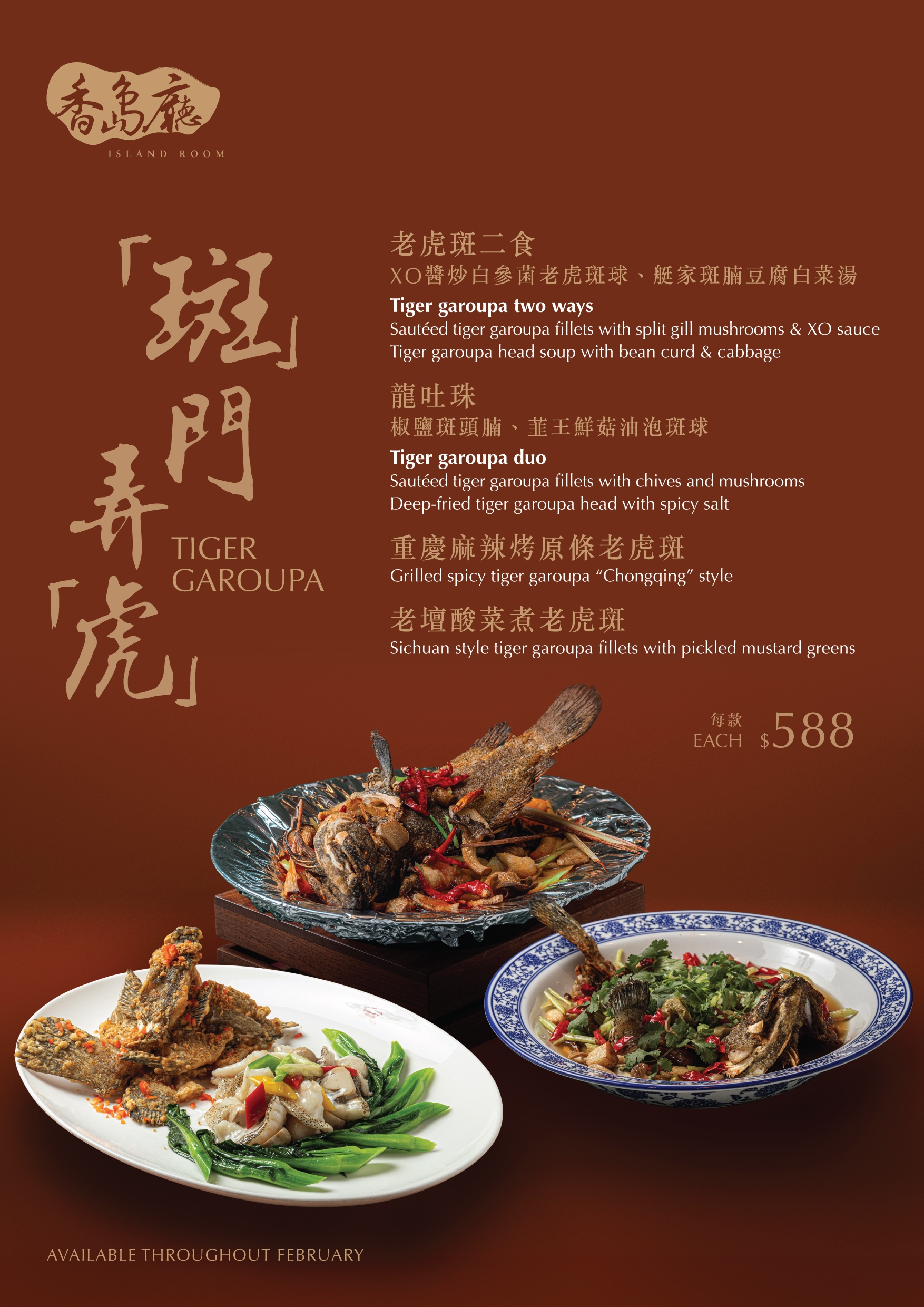 A whole steamed fish is a classic centrepiece on Cantonese dining tables at Chinese New Year, symbolizing well-being and prosperity. In celebration of the Year of the Horse, Chef Jacky and his culinary team present a special tiger garoupa menu for the Island Room.